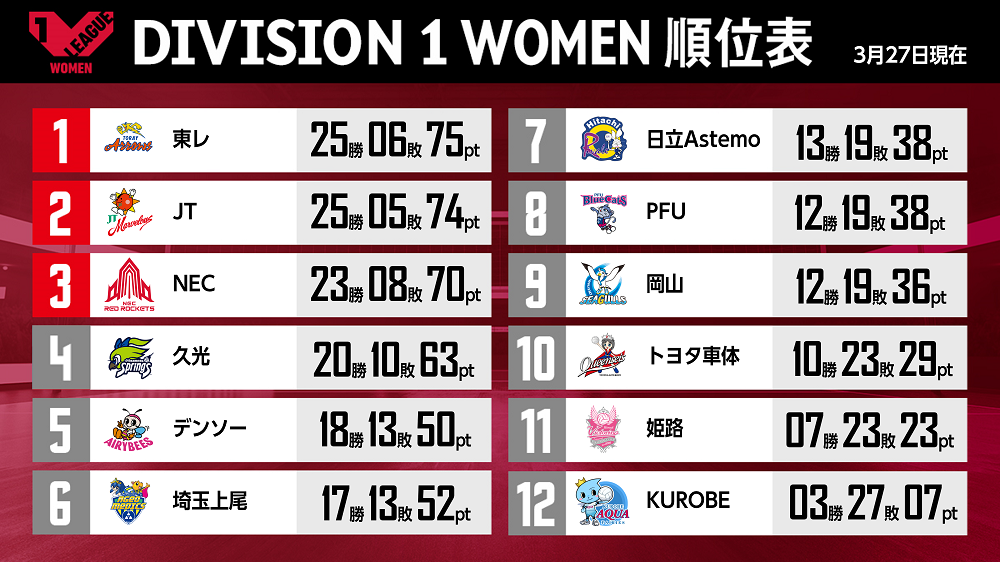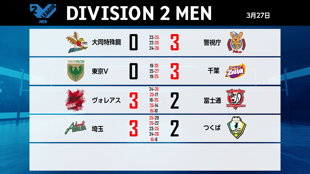 バレーボール国内最高峰リーグ V.LEAGUE【3月27日の試合結果】