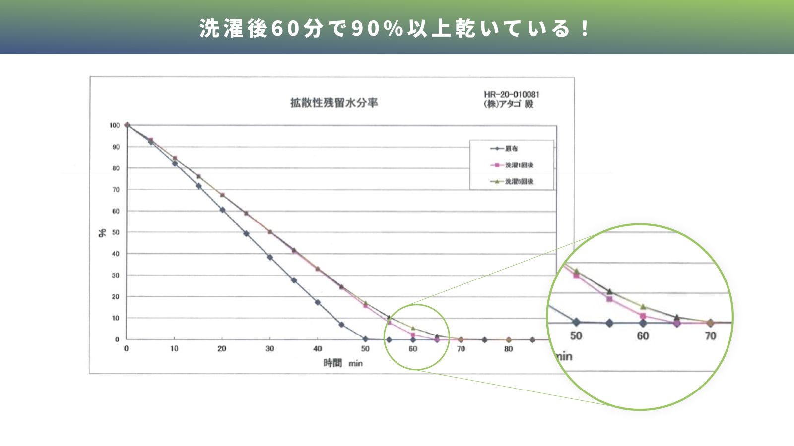 NOBILUZA®︎は「拡散性残留水分率」という、洗濯後どれくらいの水分量が残っているか?というテストにおいて、洗濯1時間後90%以上乾いているデータが実証されています。