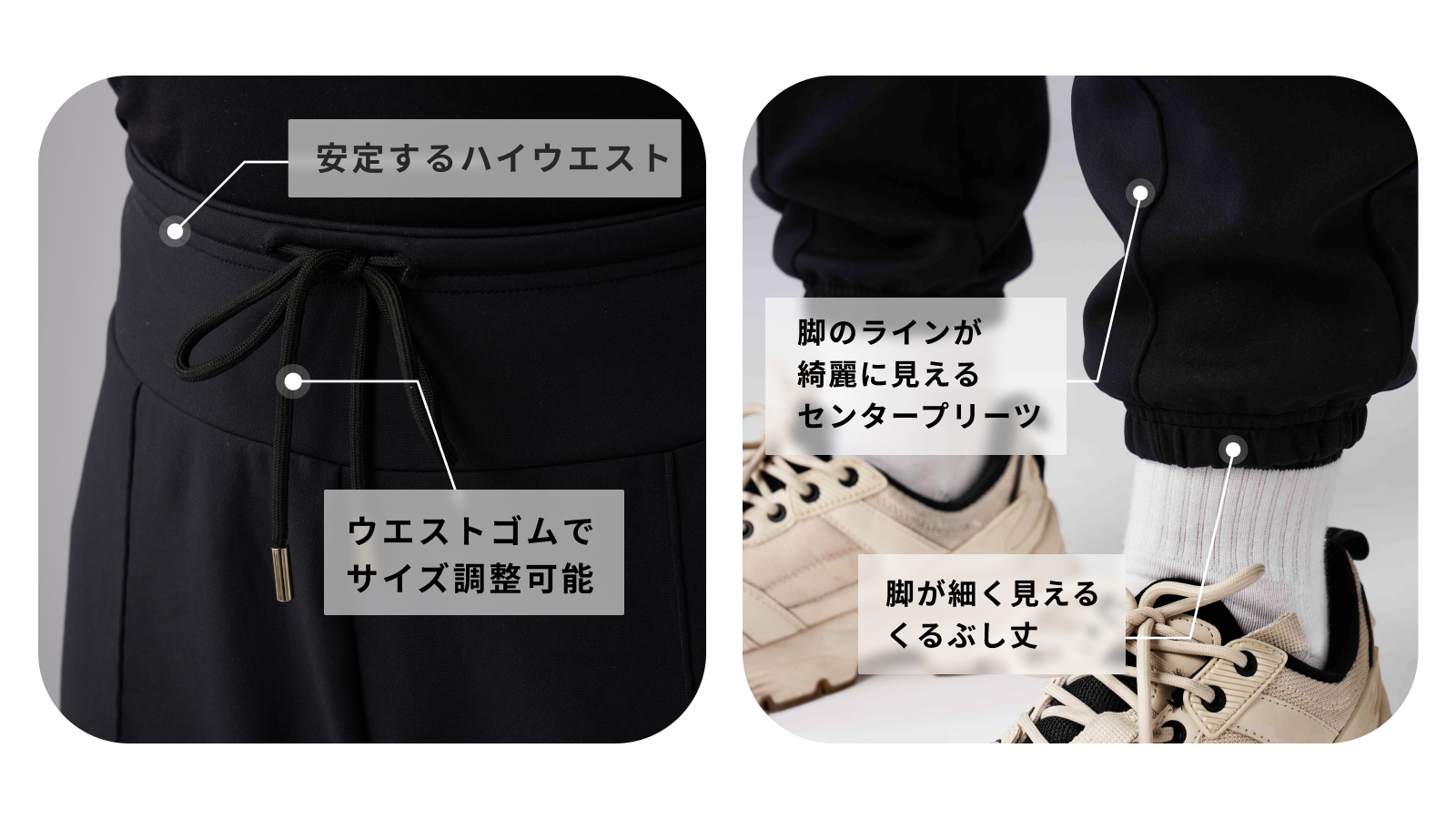 ジョガーパンツと比べて少し厚手の生地なので、身体のラインのシワが出にくい仕様になっています。