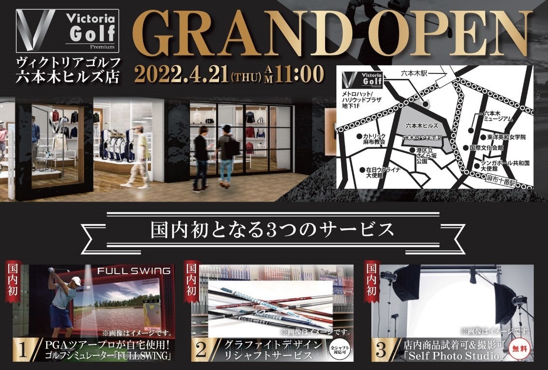 株式会社ヴィクトリア(ゼビオグループ・本社:東京都千代田区神田小川町)は、「日本国内初」となる3つの新サービスを提供するゴルフ専門店「ヴィクトリアゴルフ六本木ヒルズ店」を2022年4月21日(木)にオープンいたします。 全国に展開するヴィクトリアゴルフをより専門特化し、こだわりゴルファーに満足していだけるサービスを提供するヴィクトリアゴルフ「プレミアム」としては、9店舗目となります。