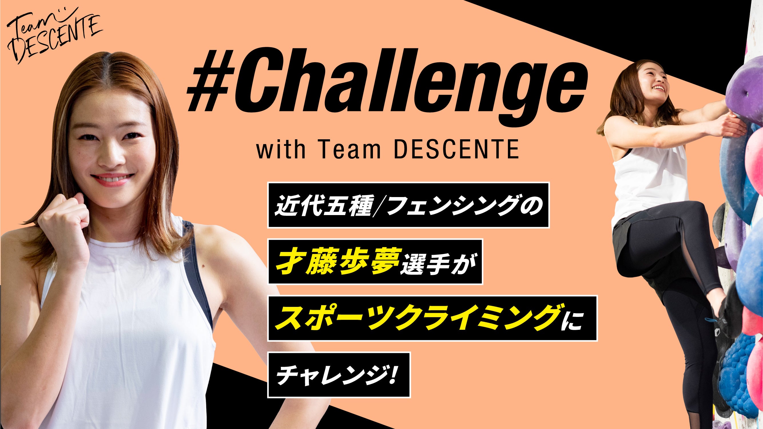 続く、第3弾では 近代五種ならびにフェンシング選手である才藤歩夢選手がスポーツクライミングにチャレンジ!プロクライマー・廣重幸紀さんの指導のもと、だんだんと難易度を上げながら複数のコースにチャレンジしました。チャレンジの様子は「Team DESCENTE公式YouTubeチャンネル」にて2022年3月30日(水)より配信します。