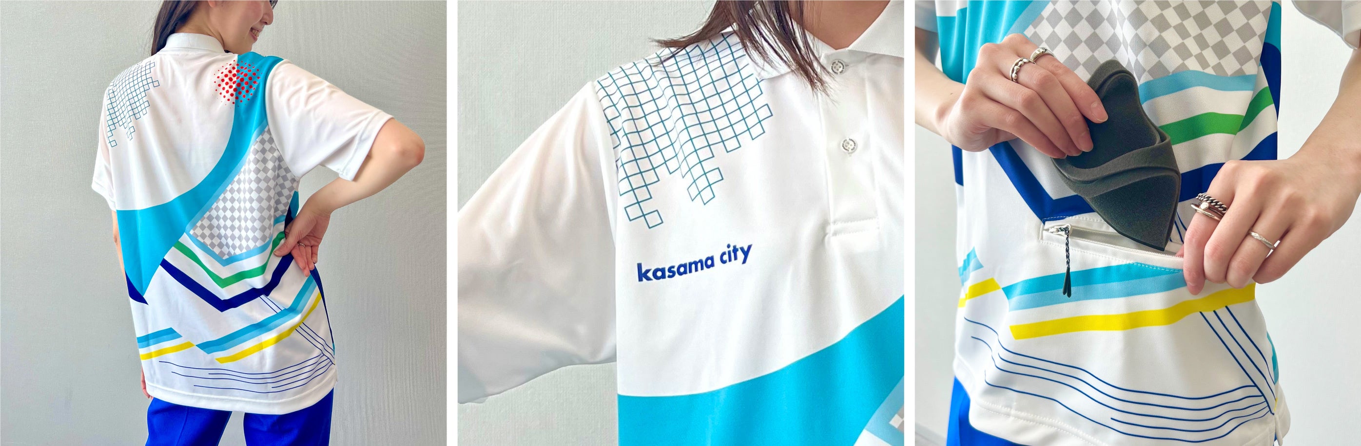 写真中)同市のPRを目的とした『kasama city』のロゴを胸部、ボタン部に表現。