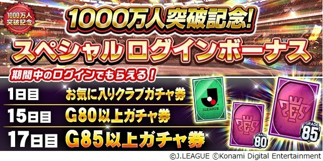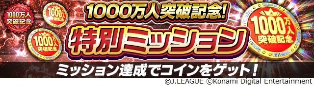 株式会社コナミデジタルエンタテインメントは、モバイルゲーム『Jリーグクラブチャンピオンシップ』(以下、『Jクラ』)が1000万ダウンロード突破を記念して、キャンペーンを開催することをお知らせします。