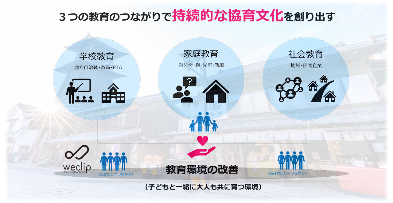 私たちweclipは、それぞれ学校教育、家庭教育、地域社会教育の3つの教育で子どもたちを育む「協育」と、そこに関わる大人も共に成長する「共育」の実現を目指しています。