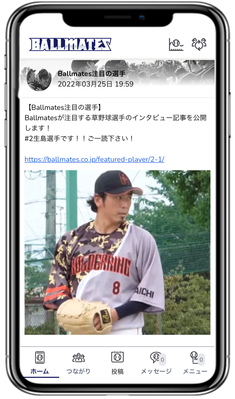 Ballmatesを使えば懐かしのメンバーや対戦相手たち、近場の野球選手、年齢の近い選手等と繋がることができ、試合結果や野球に関するトピックの情報共有が可能になります。