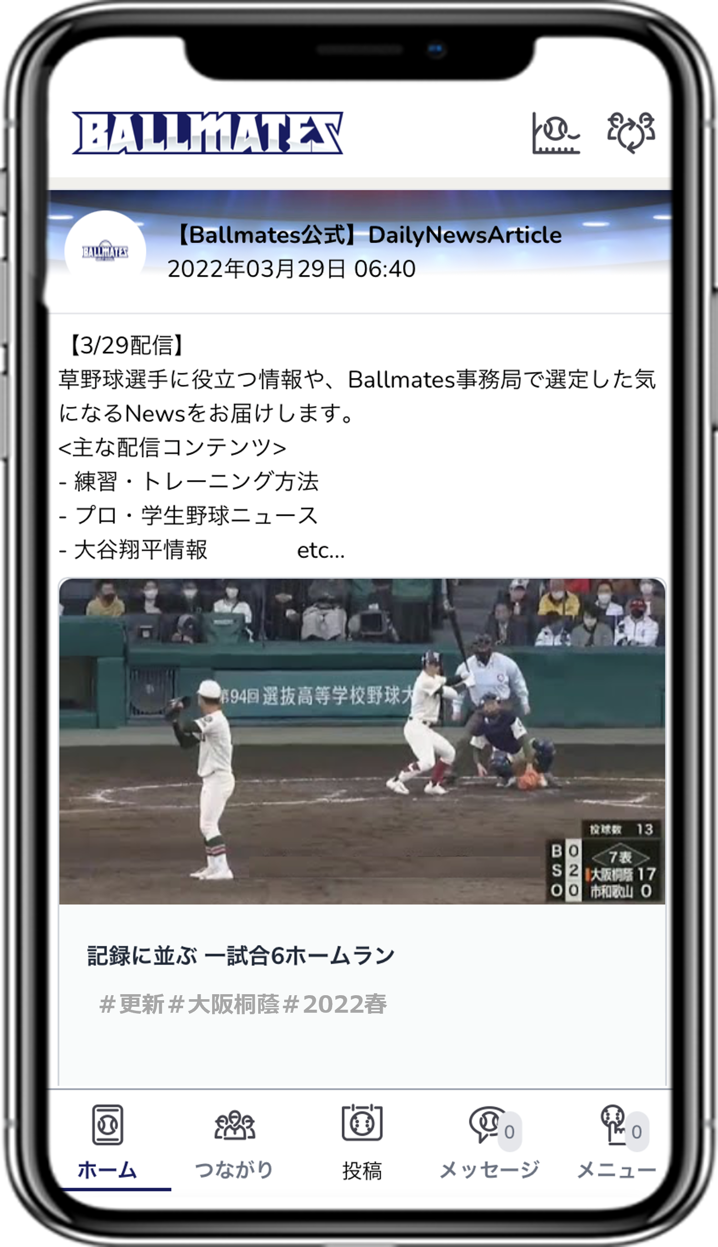 - Ballmates事務局がスキル向上や身体のメンテナンス、プロ・アマ野球に関する情報等草野球選手に役立つ記事を選定し、毎日配信しています。