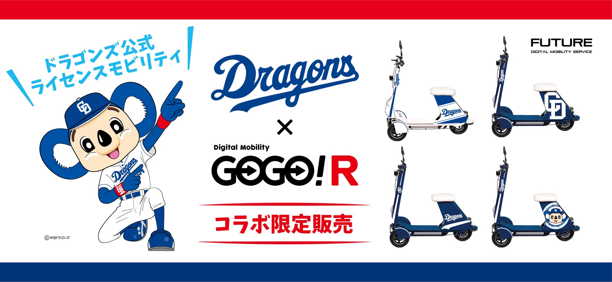 次世代モビリティおよび移動サービスの開発、販売を行うFuture 株式会社(所在地:東京都港区、代表取締役社長:井原 慶子、以下「Future」)は、 中日ドラゴンズ承認モビリティ「ドラゴンズGOGO!」を2022年4月1日(金)より限定発売いたします。