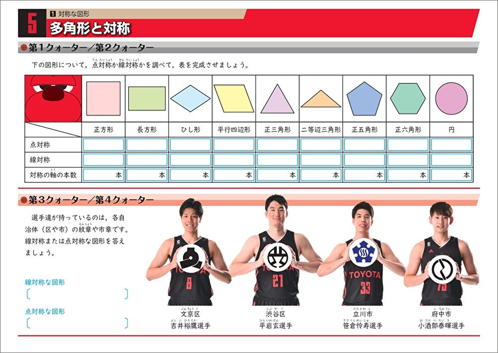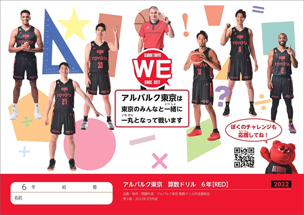この度、バスケットボールおよび当クラブを題材とした小学校6年生向けの教材「アルバルク東京算数ドリル(2022 年度版)RED」が完成しました。このドリルは、スポーツの魅力を感じながら子供たちが楽しく算数を学ぶことができるように、バスケットボールやアルバルク東京の選手・チアリーダー・マスコット等に関連した問題で構成されており、2020年度より東京都内の小学校6年生に配布しております。