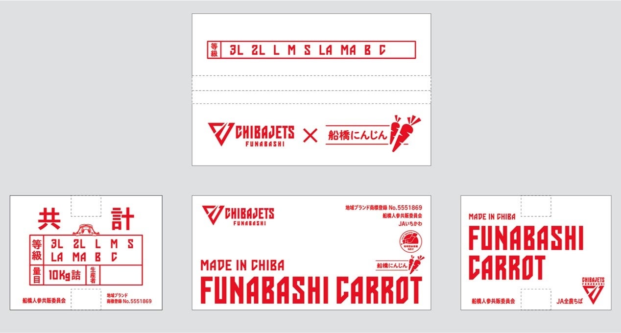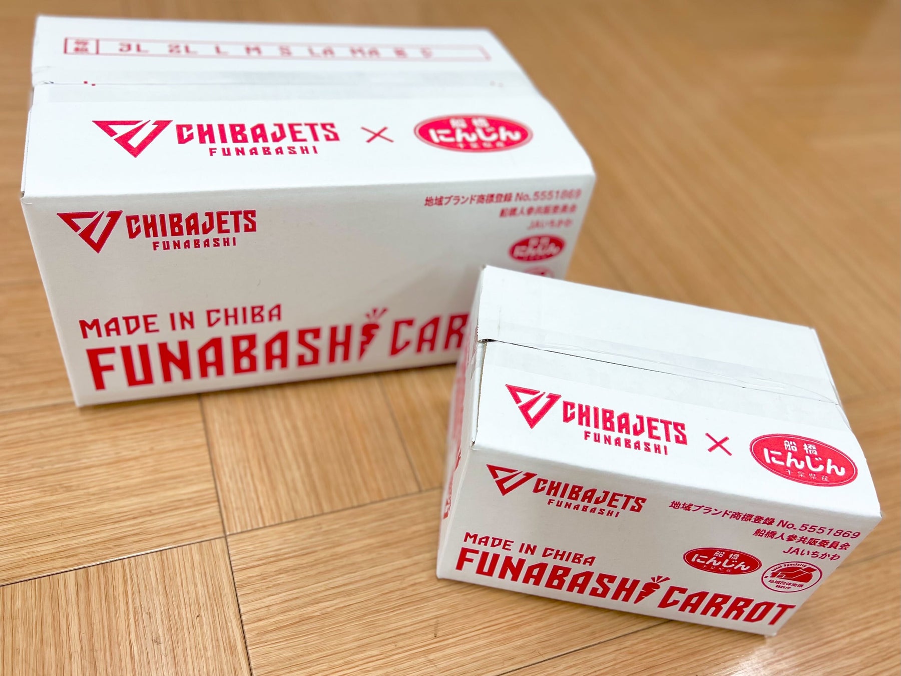 この箱は“ジェッツカラー”である赤と白の2色を基調とし、チームロゴと同じフォントで「FUNABASHI CARROT」の文字があしらわれ、すっきりと洗練されたデザインが特徴です。また、10キロ箱にはワンポイントで公式マスコットの「ジャンボくん」も描かれています。