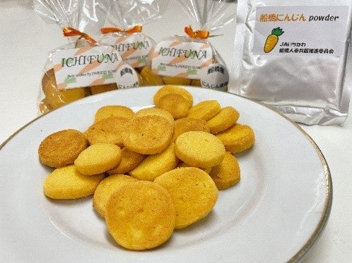 船橋市立特別支援学校が“船橋にんじん”のパウダーを使用し作った、ほんのり甘いクッキーです。パウダーは、フードロス削減のため、市場には流通させることのできない規格外のにんじんを使用しており、JAいちかわ船橋人参共販委員会が外部委託し、製造しています。クッキーはこれまで、特別支援学校の保護者向け等に販売されていました。