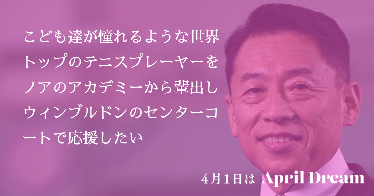 「世界で戦えるテニス選手になるには、定期的な海外遠征などが必要で家族の負担も大きい。私たちがスポンサーとして支えつつ、子どもたちが憧れるトップ選手をノアのアカデミーから輩出したい。一度でいいから所属選手がウィンブルドンのセンターコートでプレーするのをファミリーボックスで応援したい。」と夢を語るのは、ノアインドアステージ株式会社代表取締役社長大西雅之。