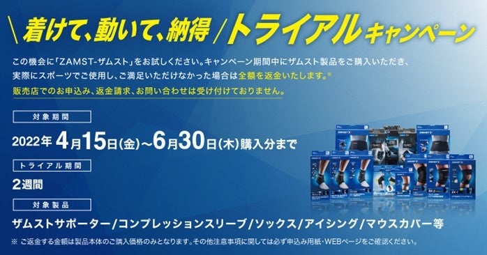スポーツ向けサポート・ケア製品ブランド「ZAMST(ザムスト)」を展開する、日本シグマックス株式会社(本社:東京都新宿区、代表取締役社長:鈴木 洋輔)は、ザムスト製品をご購入いただき、実際にスポーツでご使用した上でご満足いただけなかった場合、全額を返金する『トライアルキャンペーン』を実施いたします。