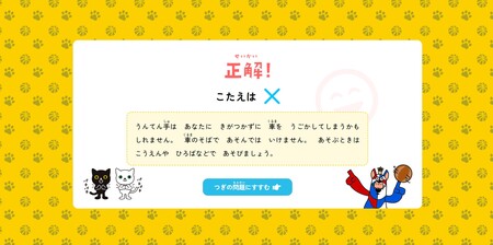 答え合わせのページには交通安全に関する解説を掲載しており、「道路への飛び出しが危険である」こと、「車の運転手には死角がある」ことなど、より学びを深めてもらうことができます。