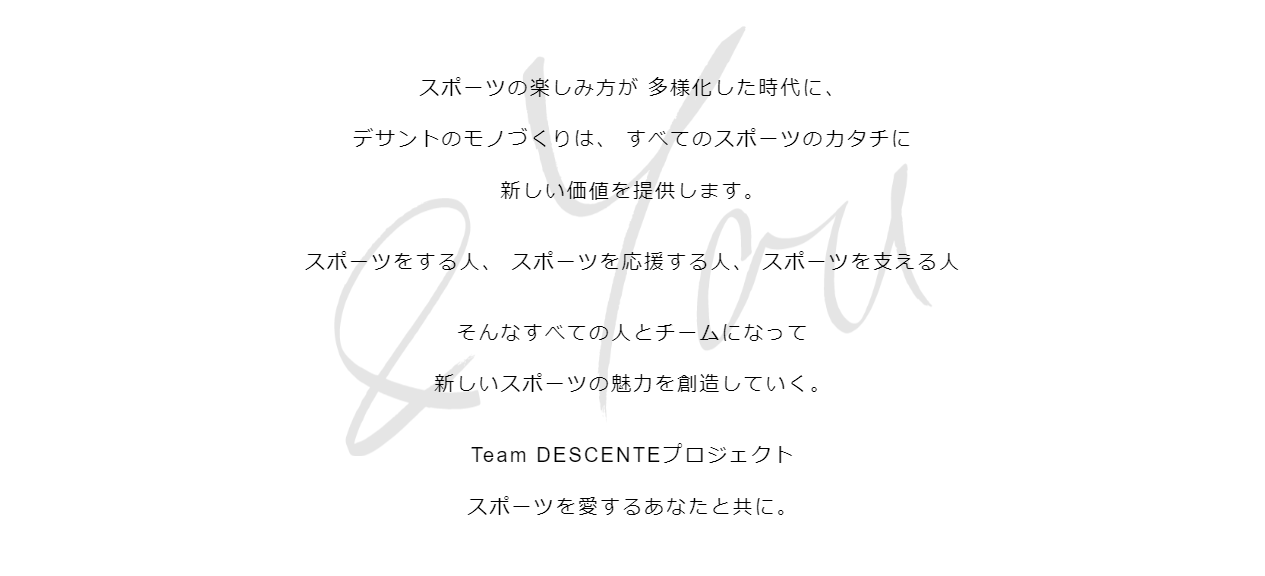 株式会社デサントは、企業理念「すべての人々に、スポーツを遊ぶ楽しさを」に基づき、当社が展開する各ブランドを代表するトップアスリートがアンバサダーとなり、お客様とつながるプロジェクト、“Team DESCENTE(チームデサント)”プロジェクトを2020年より展開しています。これは、当社が展開する全ブランドが一丸となり、スポーツを深く理解しているデサントならではの独自のアプローチで、ステークホルダーの皆様と共に、新しいスポーツの魅力を創造していくものです。(https://www.descente.co.jp/team_descente/index.html)
