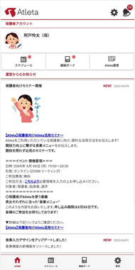 ●利用可能機能:スケジュール、連絡ボード(指導者やトレーナーから選手に向けて情報を発信する「連絡ボード」の保護者向け情報)、アトレータ通信(『Atleta』が発信するサービスや導入チームなどに関する情報)の閲覧