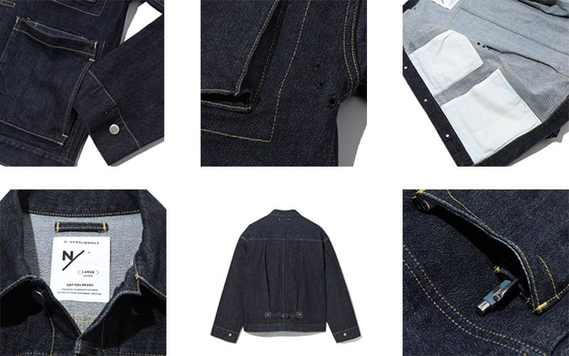 主力アイテムであるデニムジャケットは、表側に4つのポケットを配置している他、内側にも左右4カ所のポケットがあり、大小さまざまなアイテムを収納できることが特長です。また、アームホール下には、ムレを逃がすベンチレーション用のアイレットを配置したり、背面には肩や腕を動かしやすくするタックを施すなど、アクティブに行動する時の快適性を追求しています。定番のインディゴカラーの他、クリーンな印象のオフホワイトカラーもラインナップします。