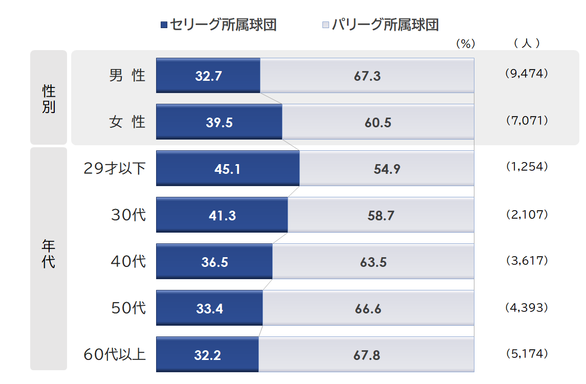 まだ開幕してから間もないプロ野球ですが、今年の近未来予想リサーチでは男女ともパリーグ所属球団が優勝するという予想結果が過半数となりました。またパリーグ優勝予測は年代の上昇とともに高まる傾向がありますが、昨年を除けば2013年から2020年まで8年連続でパリーグ球団が優勝していた記憶が中高年世代には強く残っているのかもしれません。