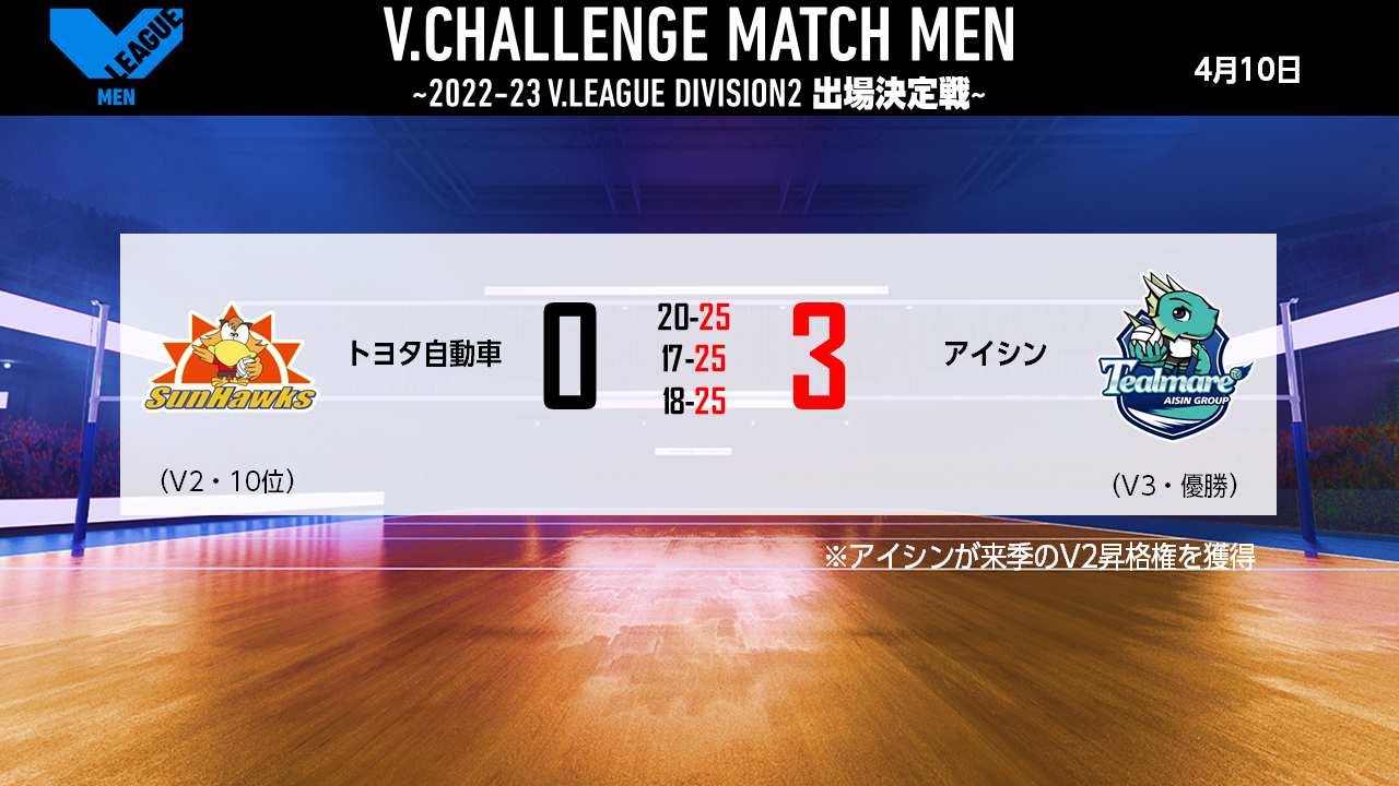 2試合ともにストレートで勝利し、V2昇格権を獲得したアイシン 4月10日 対トヨタ自動車戦