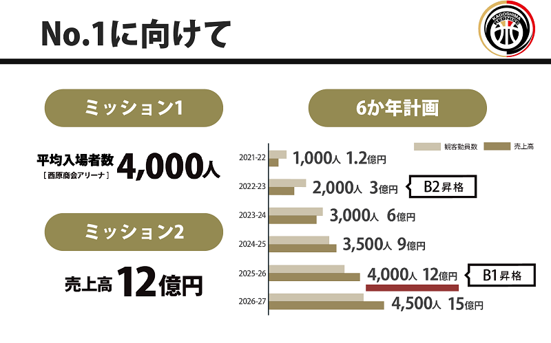 鹿児島を動かす新たな『チカラ』となることを目指す鹿児島レブナイズは、クラブを愛してくださるブースターやスポンサーの皆さまと共にB1優勝を目指します。B1昇格するためには、平均入場者数4,000人、年間売上12億円が必要となります。今回の資金調達は、これらを実現させる上での第一歩となります。