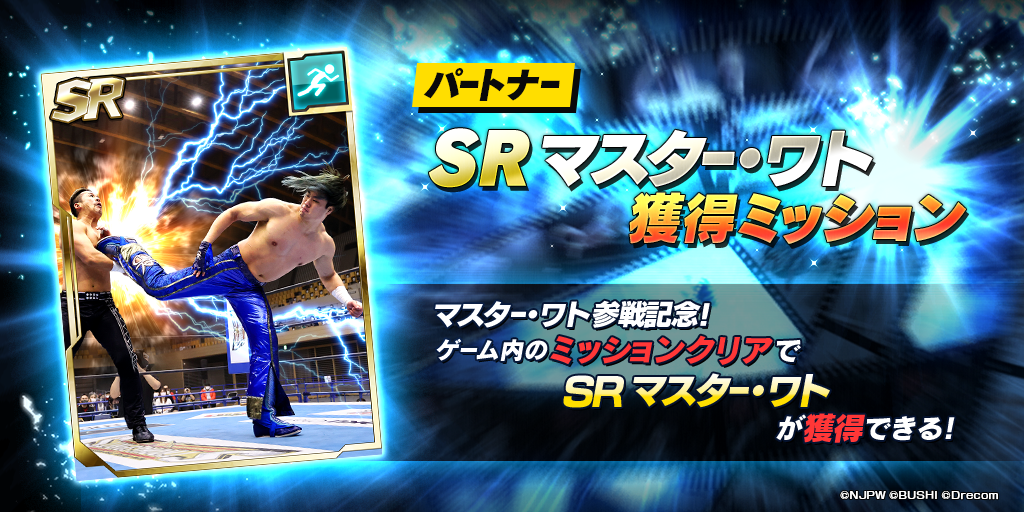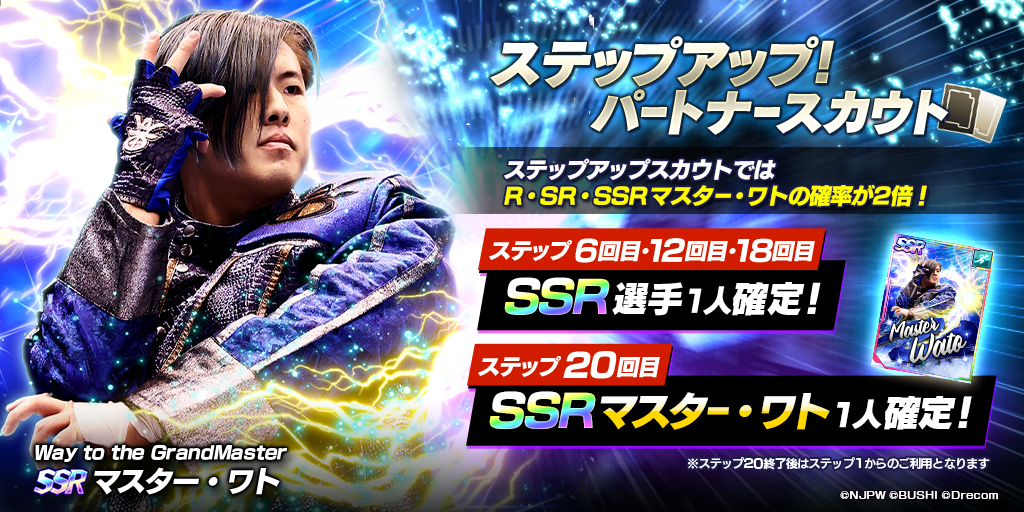 ゲーム内ではマスター・ワト選手参戦に伴い「選手スカウト」と「パートナースカウト」にてステップアップスカウトを実施、さらに新日SS公式Twitter(@njpwss)ではマスター・ワト選手サイン入り新日SSロゴ入りサイン色紙を抽選で15名様に当たるRTキャンペーンを実施いたしました。