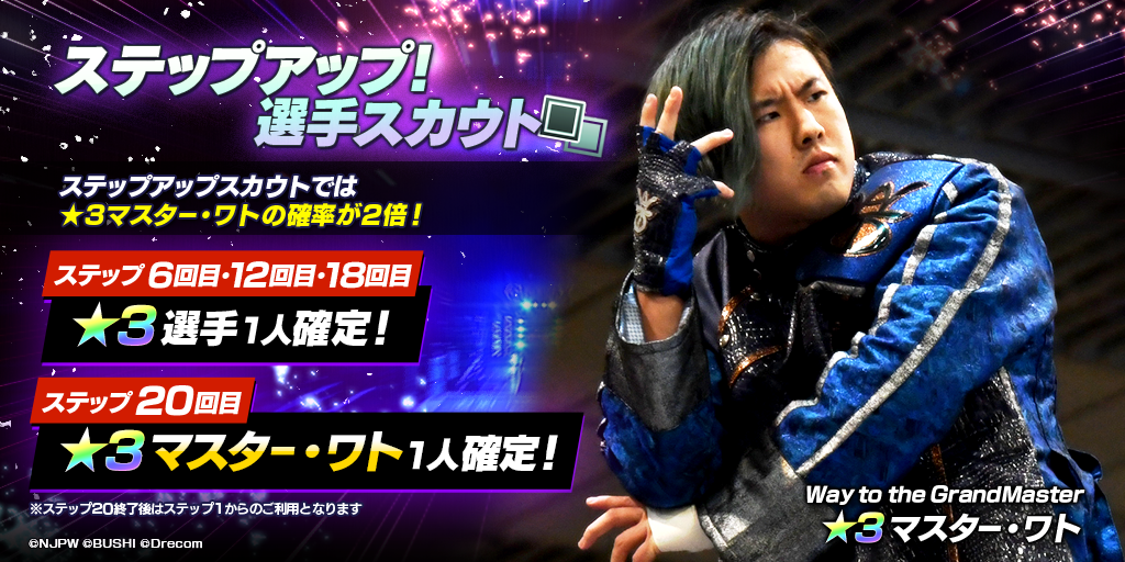 さらに、本スカウトでは初参戦★3選手「[Way to the GrandMaster]マスター・ワト」がステップアップ回数に関わらず、獲得確率が通常の2倍かつ獲得時のピース量が増量となったスカウトとなっております。