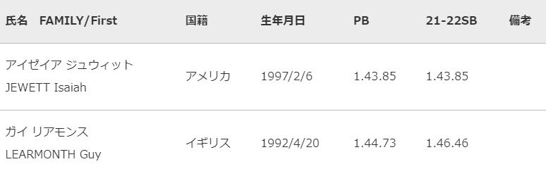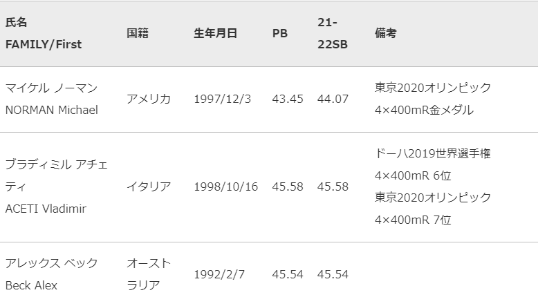 〇男子400mには、100m 9.86、200m19.70の自己ベストを持ち、東京2020オリンピック4×400mリレーで金メダルを獲得したマイケル ノーマン(アメリカ)が東京五輪の雪辱を果たすレースとなるか。