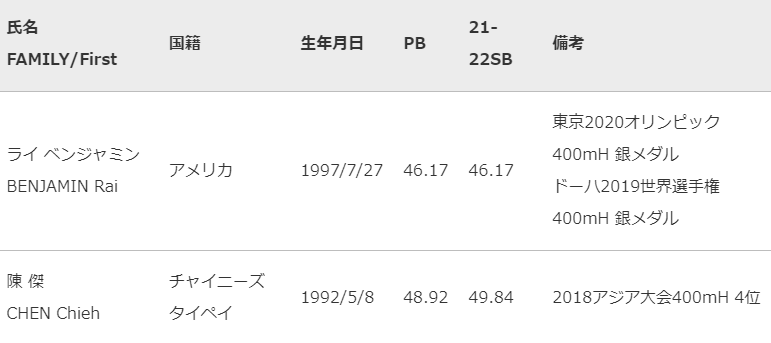 〇男子400mハードルには、東京2020オリンピックで当時の世界記録を上回り、銀メダルを獲得したライベンジャミン(アメリカ)がエントリー。東京五輪日本代表の黒川和樹・山内大夢・安部孝駿が日本記録を更新し、世界に近づくレースに期待!