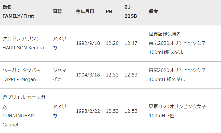 また、男子400mには東京五輪4×400mリレー金メダリストで日本人の母を持つマイケル ノーマン、女子100mハードル世界記録保持者で東京五輪銀メダルのケンドラ ハリソンが出場を予定しています。