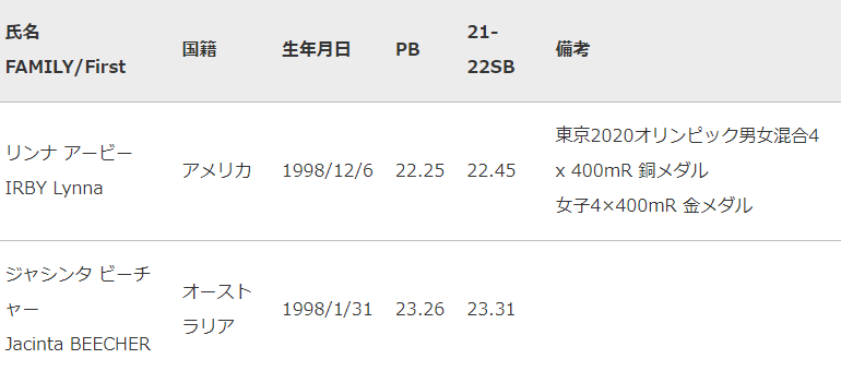 〇女子200mには、東京2020オリンピック男女混合4 x 400mリレーで銅メダル、女子4×400mリレー金メダルを獲得したリンナ アービー(アメリカ)がエントリー!