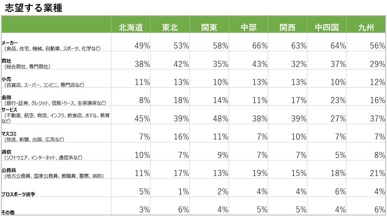 「志望する業種」に対する質問では、全エリア共通でメーカー・サービス・商社がトップ3となった。また、「企業選択のポイント」に対する質問では、全エリア共通で「会社や業界の安定性」がトップとなった。学生の志向として「会社や業界の安定性」がキーワードとなっていることが読み取れる。