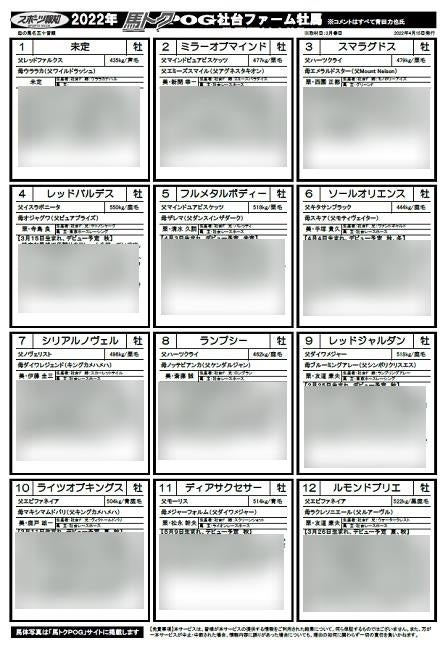 「社台ファーム」、「追分Fリリーバレー」、「ノーザンF早来」、「ノーザンF空港」(いずれも両面)がセットになった商品が1000円(税込)、牧場毎の商品が400円(税込)と、お得な価格設定。毎年のように多くのG1ホースを競馬場に送り込む社台グループの牧場で育成された2歳馬たちのスタッフコメント、血統を含めたプロフィールなどの情報がぎっしり詰め込まれています。馬体写真は「馬トクPOG」の2歳馬特集ページ(https://umatoku.hochi.co.jp/pog_pickup2022)で公開します。