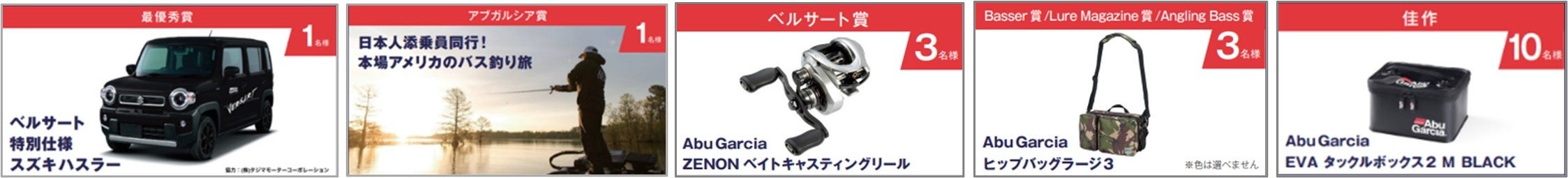 本フォトコンテストは、ベルサート同様にスタイリッシュなマットブラックにアブガルシアとベルサートのロゴを施したベルサート特別仕様のスズキハスラーや、出国から帰国まで日本人添乗員が同行し、現地バス釣りガイドの通訳もしてくれる、聖地アメリカでのバス釣り旅などの、超豪華賞品がもらえるフォトコンテストです。