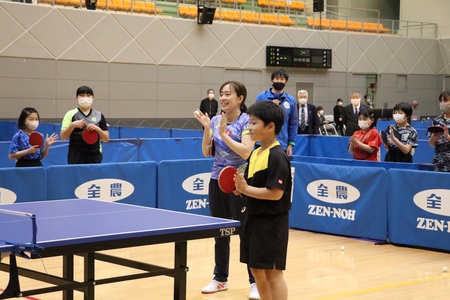 全農の広報・調査部の新妻成一部長の「しっかりごはんを食べて、立派な選手になっていただきたい」という激励の言葉から始まった卓球教室。石川選手は自らのプレーを福島の子どもたちに披露し、子どもたちと一緒に汗を流し卓球の楽しさを分かち合いました。子どもたちは世界トップレベルのプレーをみて「打球が早い」や「フットワークがすごい」と感想を述べ、「今後の練習に活かしていきます」と笑顔で話しました。
