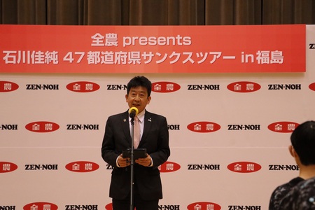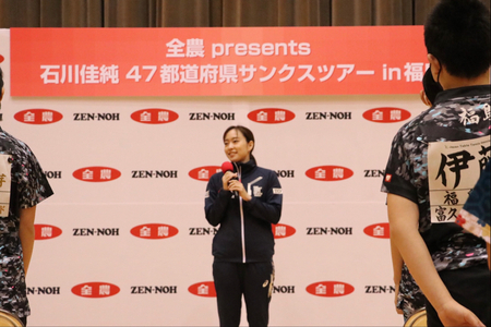 「石川佳純47都道府県サンクスツアー」(企画:IMG)は47都道府県での開催を想定しており、記念すべき第一回は、東日本大震災より11年経過した今、更なる復興の想いを込めて『福島県』にて全農主催で開催。石川選手は冒頭のあいさつで子どもたちに向けて「第一回という事で私も緊張しています。卓球の練習や会話を通じて一日楽しんでもらいたい。皆さんが今後、卓球をする時のパワーを送れたらと思っています」と挨拶しました。