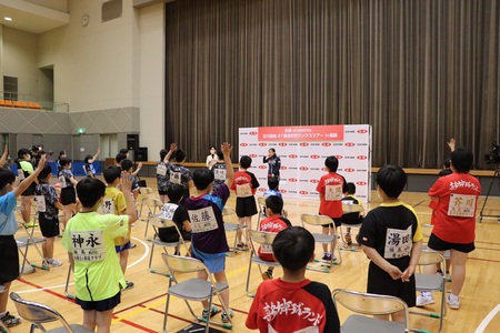 子どもたちからの質問コーナーでは「練習中におなかがすいたら何を食べますか?」という質問に、「おにぎり、バナナ、ヨーグルトなどを食べます。おにぎりをたべることが一番多いですね。」と笑顔で回答。子どもたちとの会話のラリーも楽しんでいました。