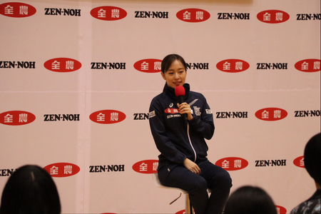 イベントでは「スポーツと食」をテーマにしたトークショーも開催。普段から食事に気を遣っているという石川選手は「炊飯器とお米を持って行って、毎日3食お米を食べています」と海外遠征時の食事や「ニッポンの食」の大切さについて語りました。また小学生時代には「トマトやピーマン」などの野菜が苦手だったと話し、苦手を克服したきっかけについて「好きな味付けにして食べたり、まずは食べられる野菜から食べて、時々苦手な野菜にも挑戦したりすれば克服できると思います」とコメント。子どもたちへ好き嫌いせず食事をすることの大切さを伝えました。その他にも小学生時代の練習方法や悔しかった経験、全農杯全日本卓球選手権大会(ホープス・カブ・バンビの部)での思い出などを語り、子どもたちも興味深そうに聞き入っていました。