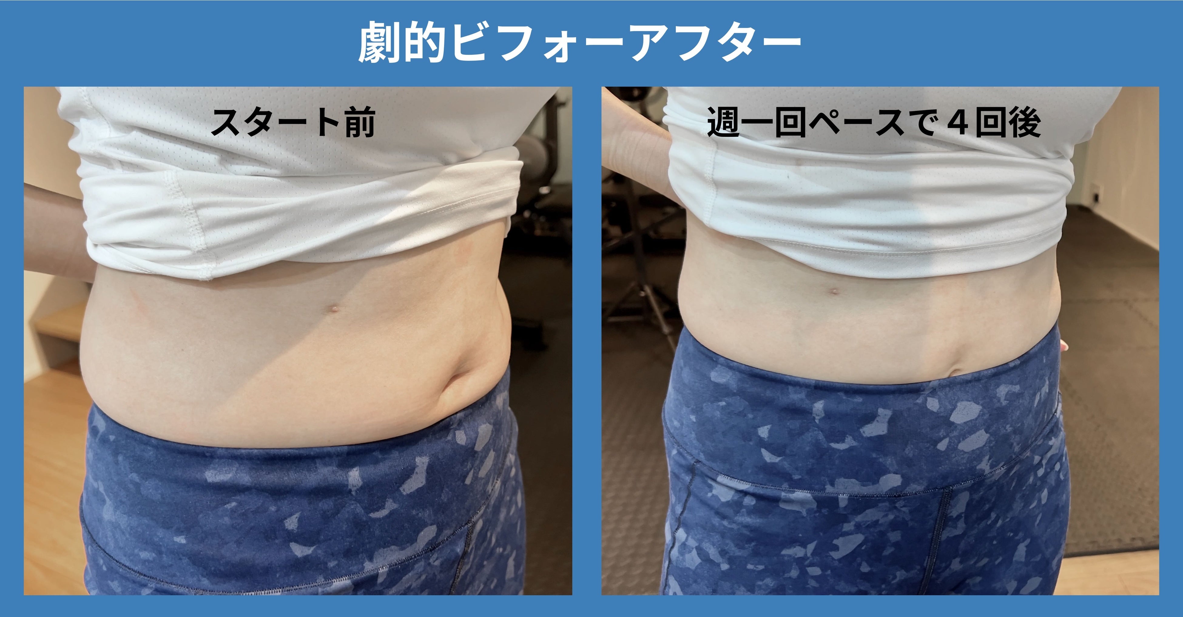 週一回のペースで、たった4回のトレーニングですが、右の写真では明らかにお腹まわりの脂肪が取れてきていることがわかるかと思います。