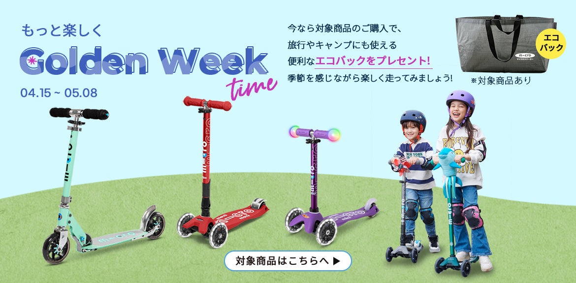 マイクロスクーター公式サイトではゴールデンウィークを迎え、この季節のお出かけやキャンプ等におすすめの3輪、2輪キックボードを紹介しております。また、対象商品を購入するとキックボードとヘルメット等を入れ、持ち運びに便利なマイクロオリジナルエコバックをプレゼントするキャンペーンを 4/15(金)~ 5/8(日)まで実施します。