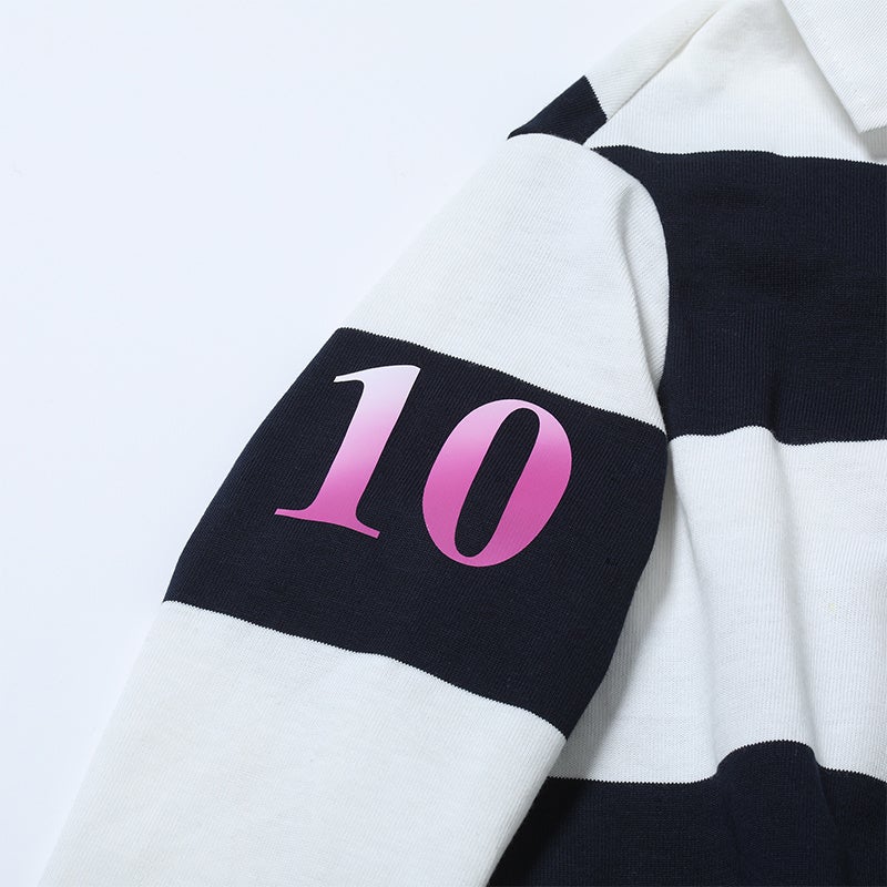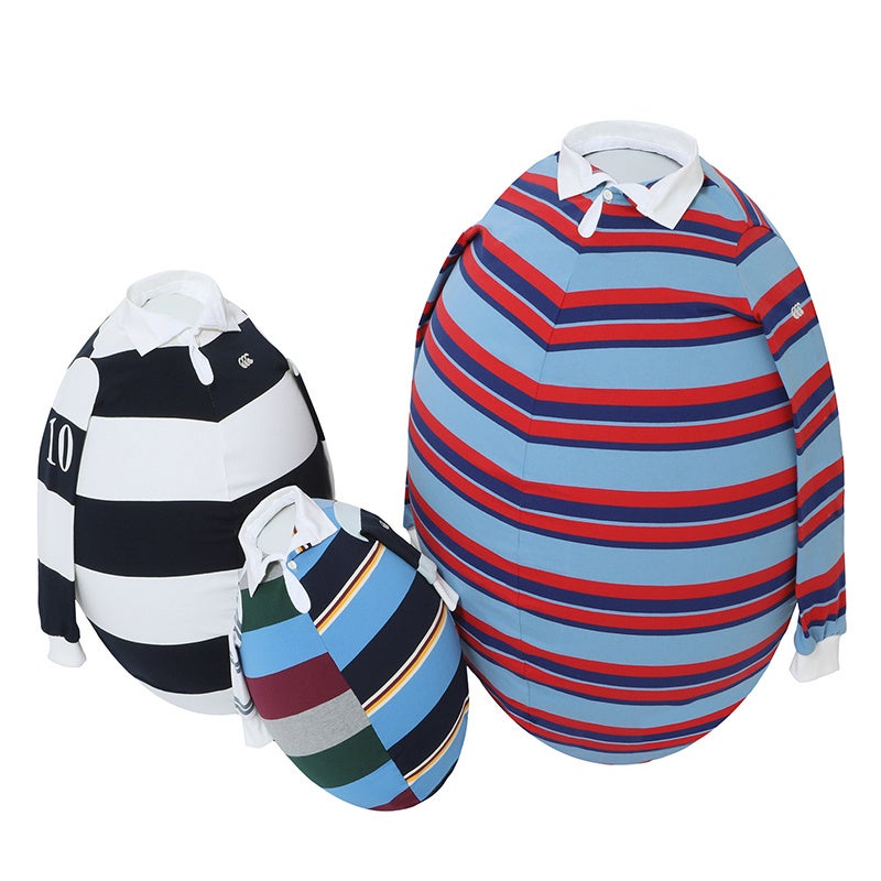 仲間と情熱を共有する喜びを大切にするラグビーから着想を得て、性差や年齢、体型差といった壁を越え、誰もが等しく着用できる服としてANREALAGEがデザインしたラグビーボールの形の服。CANTERBURYの代名詞である伝統のラグビージャージーをベースとし、素材には生産過程の残反を利用しています。太陽光に反応して炎のように変色する特殊プリントでナンバーを入れています。
