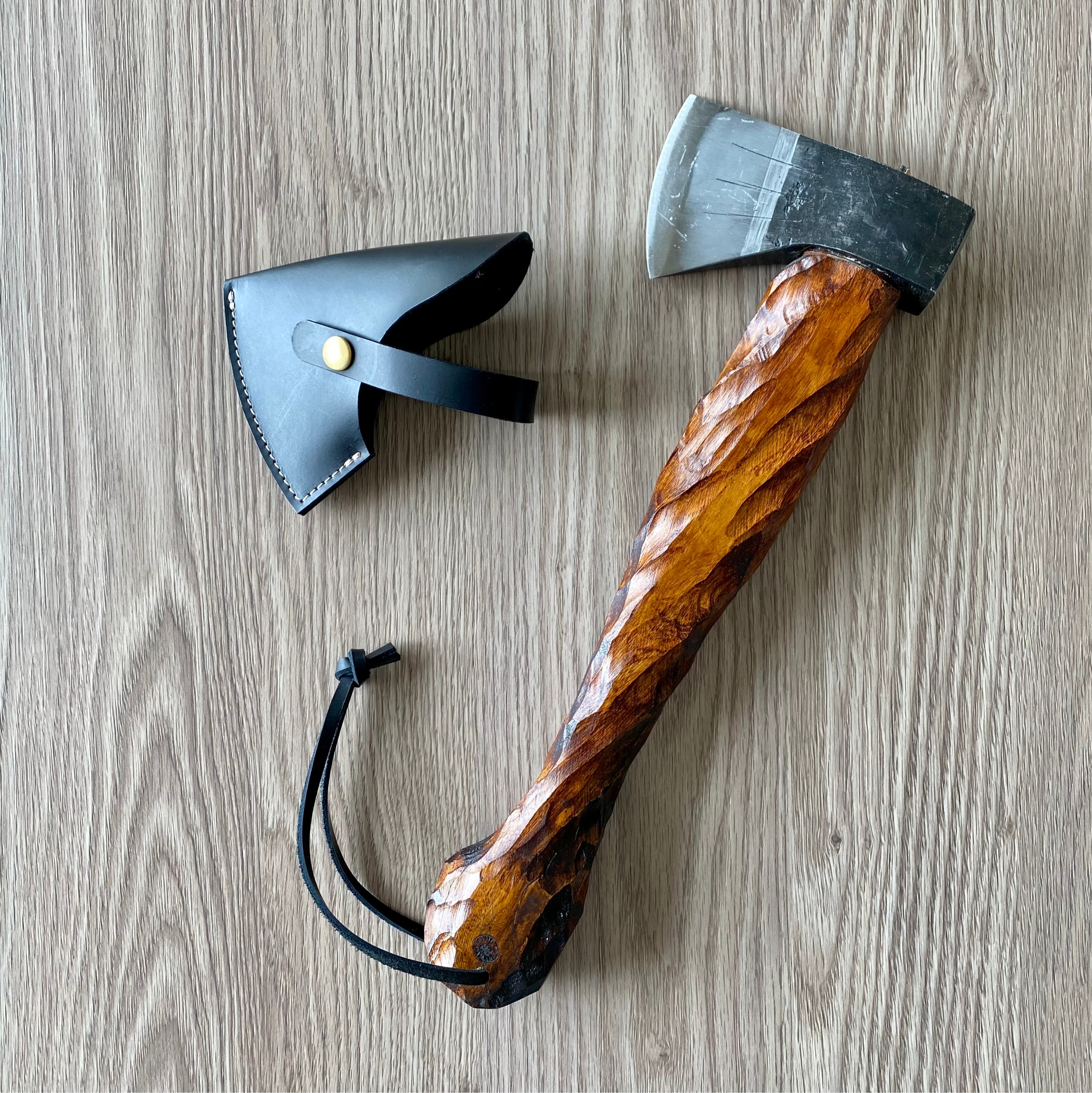 キャンプでの使いやすさを追及した、和斧の切れ味・耐久性と、洋斧の広葉樹に対する強さを兼ね備えた斧です。柄の長さ、革のカバーの色、利き手の3点をオーダーでお選びいただけます。