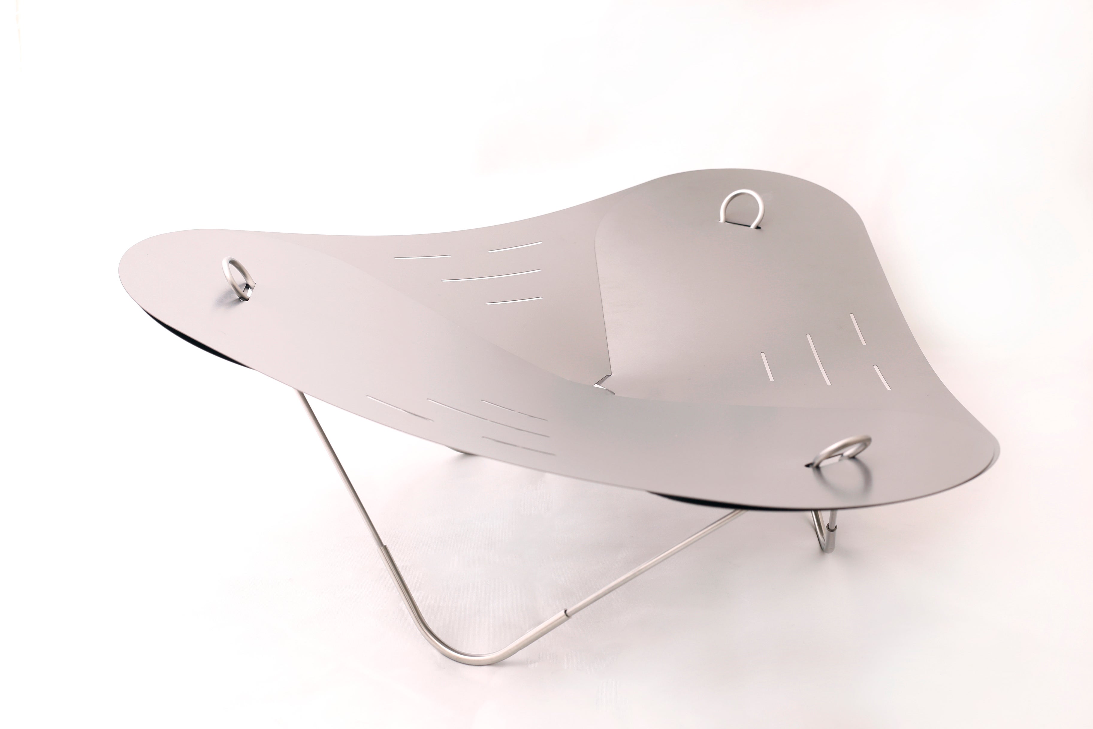優美な姿の焚き火台。脚の角度の工夫と、ステンレスのしなやかさが相まって、この優雅なカーブを生んでいます。 ステンレスの3枚の板を組み合わせ、ステンレスの脚を嵌め込ば、あっという間に組み立てが完成します。脚をはめることで、ステンレスの板が少したわんで薪が乗りやすくなり、空気の供給もスムーズに促されます。さらに板にあいている空気穴が燃焼を促します。