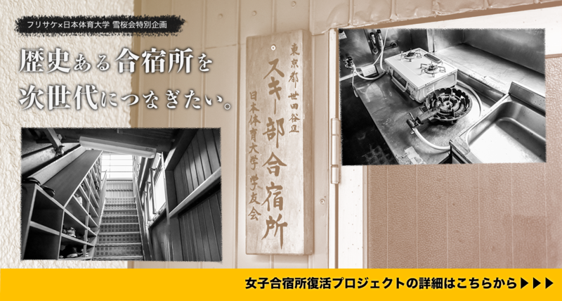 日本体育大学 雪桜会(日本体育大学学友会スキー部、部長:竹腰誠)とタッグを組み、特別企画として女子寮復活プロジェクトを開始します。創部58年を迎えるスキー部では2013年まで女子合宿所が世田谷にありました。その後部員の構成からしばらくは女子寮の運営は休止していたのですが、女子学生の増加を含め、キャンパスへのアクセスや練習環境の拡充のために、2022年に女子寮への改修をすることになりました。しかし同合宿所(寮)はすでに50年を超える建物であり、改修する場所が膨大になっていました。部長個人による借り入れでのリフォームには限界があり、いまだ目標とする改修は50%程度です。