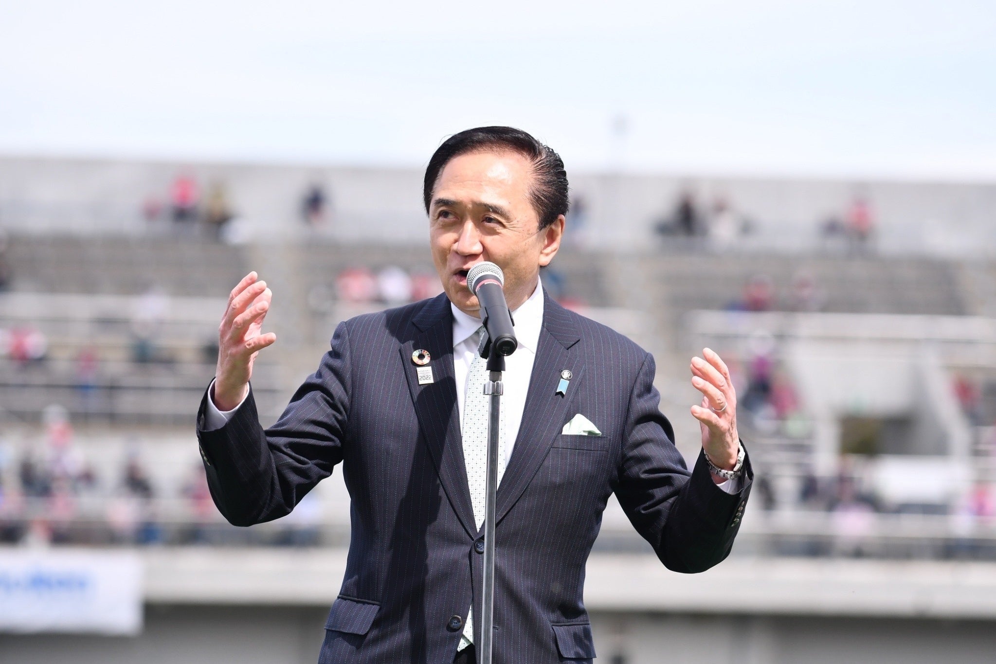 協定締結式後、ピッチにて黒岩神奈川県知事には、スタジアムにお越しいただきましたサポーターの皆様へ向けご挨拶を頂き、キックインセレモニーも実施頂きました。