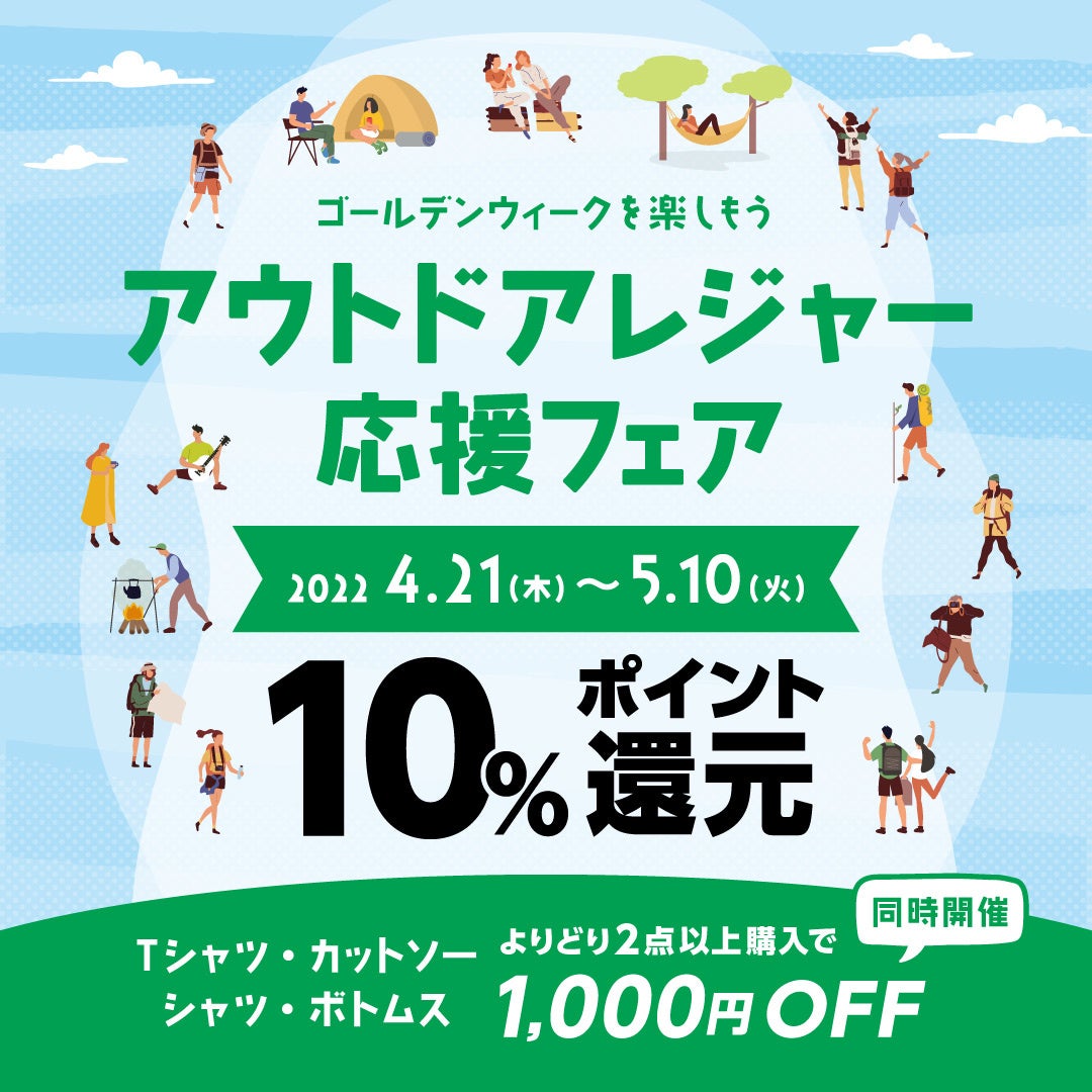待ちに待った大型連休を目前に迎え、登山やキャンプなどのアウトドアを楽しむのにぴったりな季節となりました。爽やかな初夏のシーズンを満喫するために、好日山荘ではしっかりとしたギア・ウェアアイテムの準備をおすすめしています。「GWアウトドアレジャー応援フェア」期間中は、好日山荘メンバーズポイントの還元率が通常の2倍となる10%還元のほか、協賛ブランドアイテムをご購入いただくと15%還元となり大変お得です。