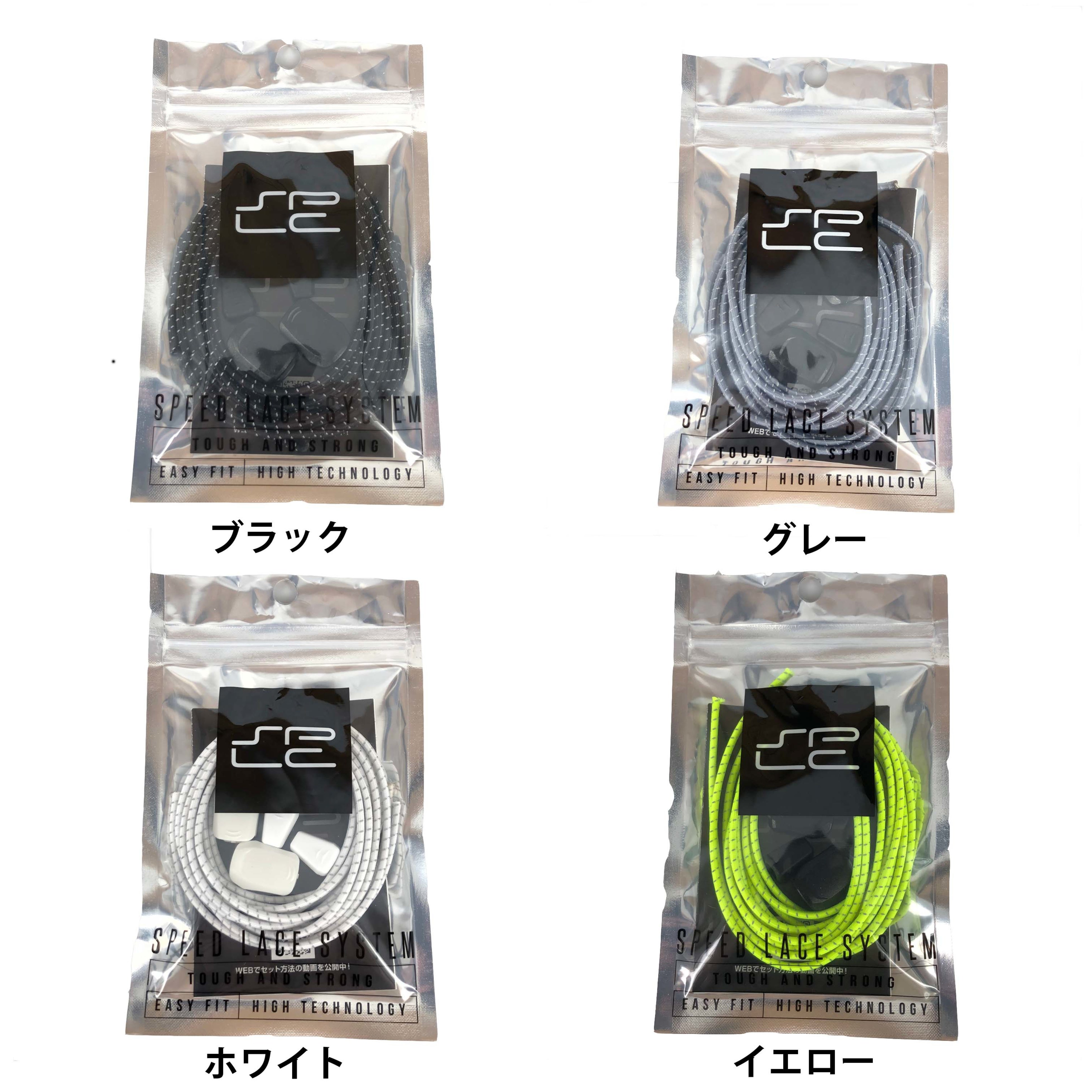ブラック、グレー、ホワイト、イエローの4色展開となります。パーツ色は、ホワイトのみ紐と同色となり、他はブラックとなります。