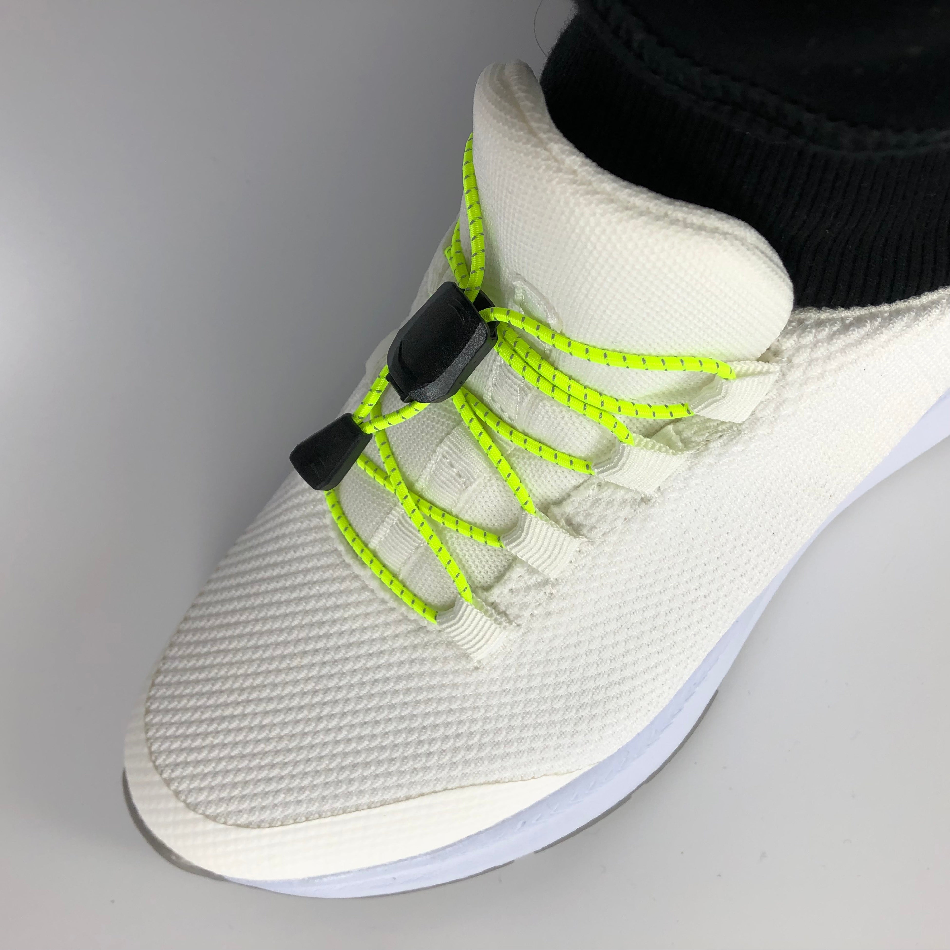 また、ゴム紐の伸縮性をいかして、紐の余り部分も好みのフィッティングやシューズデザインに合わせてご自身で調整可能です。