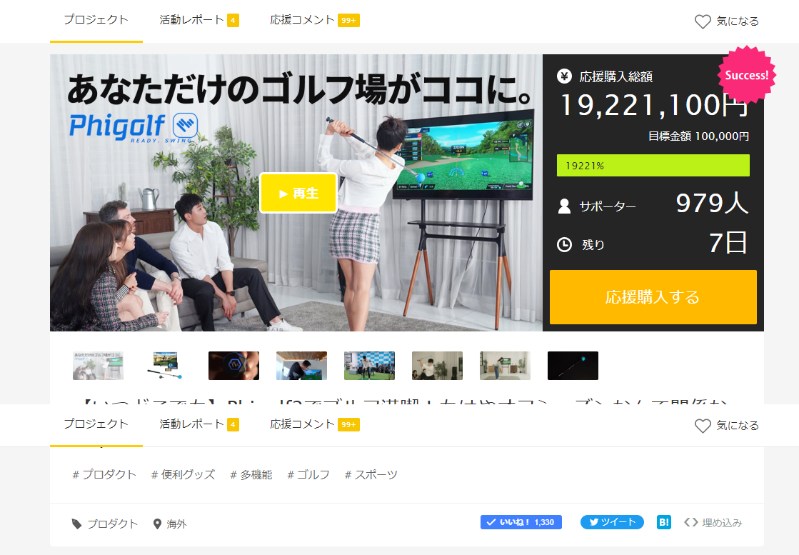 2022年3月24日(木)よりクラウドファンディングサイトMakuakeにてオープンした家庭用モバイルゴルフシミュレーター「Phigolf2」プロジェクトは開始より反響も大きく、すでに支援者979名・支援額1900万円を超え、最終日2022年4月28日(木)に向けて更に加速中です。
