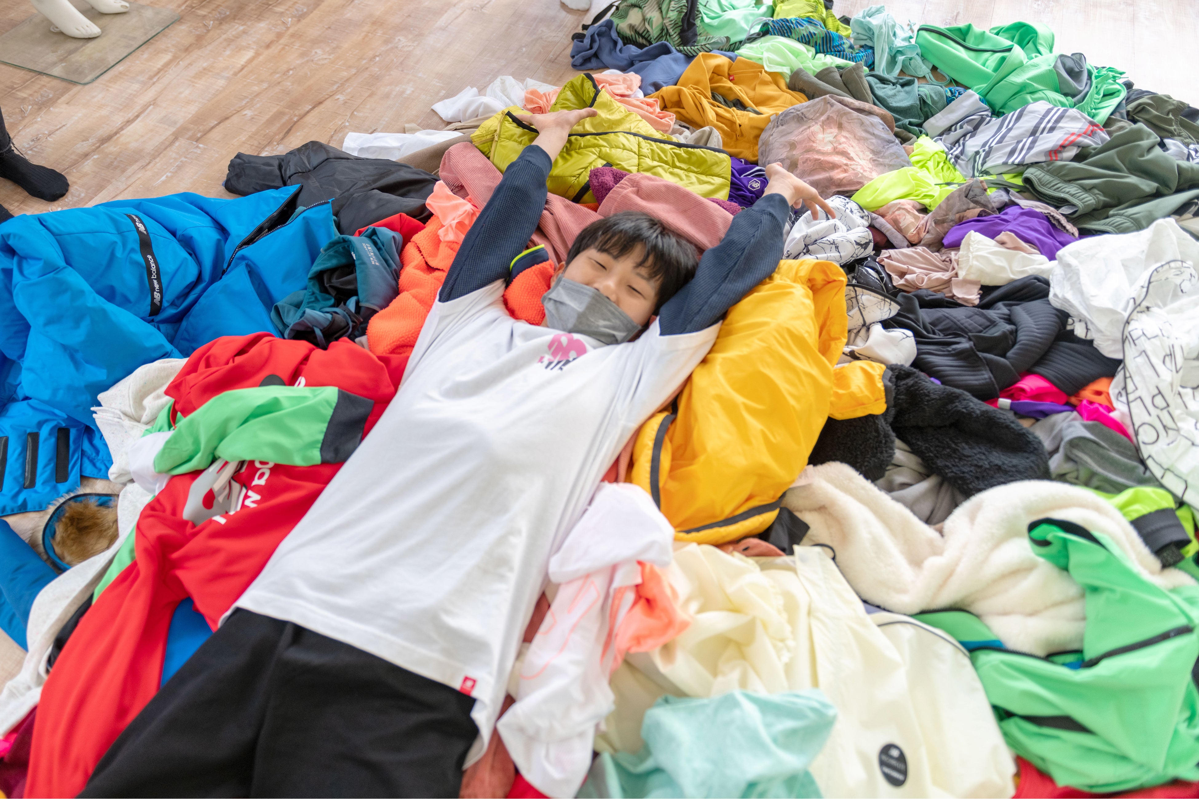 「Earth Day」にちなみ“地球”をテーマとした今回のコレクションを表現するためのアートを、クリエイターの鷲見友佑さん、パラリンアートアーティストのはたあつきさん、ニューバランスアンバサダーの山本まさみさんとのコラボレーションで制作しました。シューズのインソールや、アパレル、バッグなど、本来なら廃棄されてしまう使用済のサンプルを用い、クリエイターの鷲見さんとパラリンアーティストのはたあつきさんがワークショップを実施。アパレルどうしを結び、身に着けて、新たな形を生み出しました。ワークショップを経て、鷲見さんはインソールやバッグを活用したヘッドピースとハンドピースを製作。キービジュアル作成に向け、イメージをふくらませ、役目を終えたサンプルに新しい命を吹き込みました。そして、キービジュアル撮影には、ニューバランスアンバサダーの山本まさみさんをモデルに迎えます。ワークショップで得た「結ぶ」という手法から9つの「9BOX」Tシャツを結びひとつの衣装として山本さんが着用。そして、カラフルなサンプルから再生した新たな装いを身につけ、生命を花に見立てて表現しました。