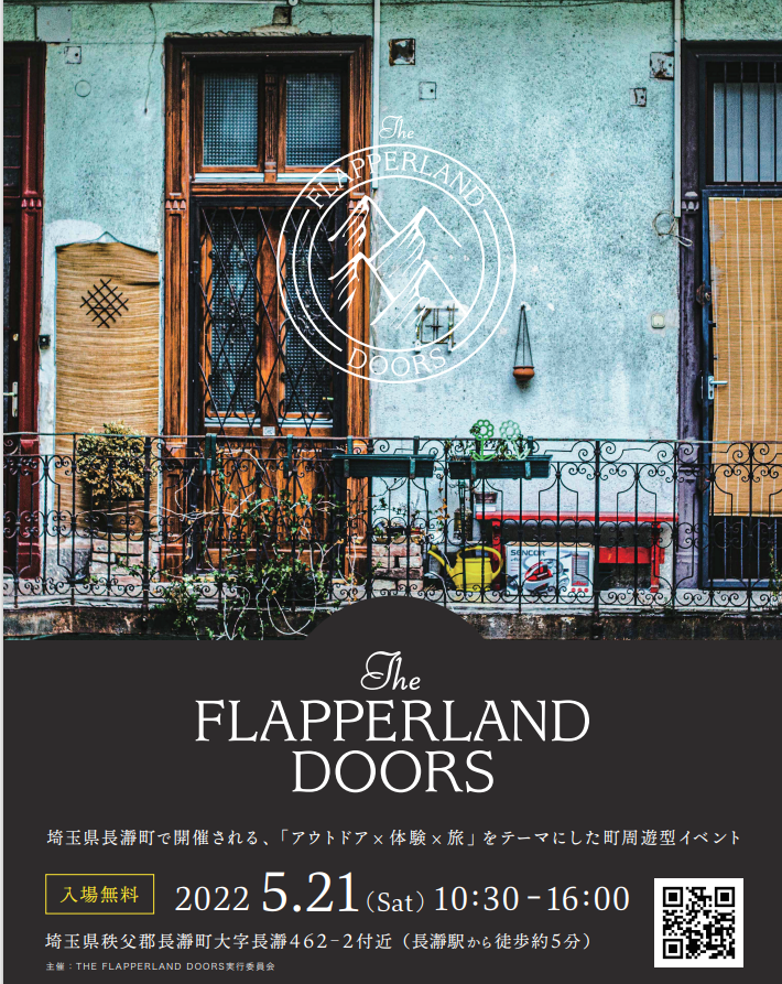 「THE FLAPPERLAND DOORS」(フラッパーランド ドアーズ)は、アウトドアギア展示会を軸に、長瀞町の既存コンテンツである「アウトドア」や「観光」、「自然」を参加者に楽しんでもらう、町全体を活用したイベントです。本イベントは都心から日帰り可能なアクセス、かつアウトドアコンテンツや自然が豊富な長瀞町の既存資源を活かした新しい形のイベントで、昨年が初の開催となり1,476人もの方にご来場いただき、今回は第2回目の開催が決定いたしました。