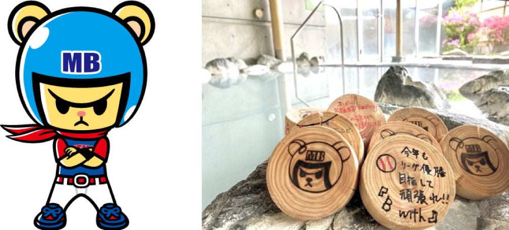6 月 24 日は埼玉武蔵ヒートベアーズの公式キャラクターである「エンビー」の誕生日。エンビーをお祝いするイベントとして、おふろにエンビーの焼き印付きのヒノキ入浴木を浮かべます。入浴木には店舗のお客さま・スタッフ、埼玉武蔵ヒートベアーズファンのみなさまからエンビーへのお祝い・応援メッセージを記入いただきます。